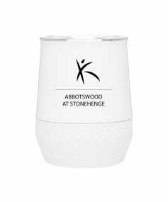 12 oz double wall 18/8 stainless steel thermal tumbler with copper vacuum insulation, push-on lid, matching swivel closure, and removable silicone base.