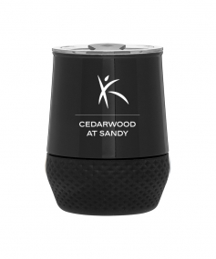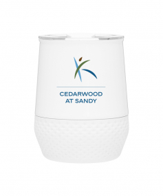 12 oz double wall 18/8 stainless steel thermal tumbler with copper vacuum insulation, push-on lid, matching swivel closure, and removable silicone base.