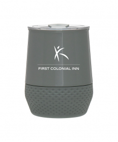 12 oz double wall 18/8 stainless steel thermal tumbler with copper vacuum insulation, push-on lid, matching swivel closure, and removable silicone base.