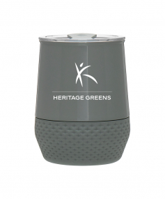 12 oz double wall 18/8 stainless steel thermal tumbler with copper vacuum insulation, push-on lid, matching swivel closure, and removable silicone base.