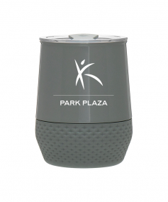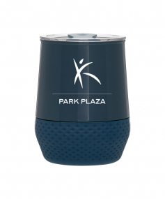 12 oz double wall 18/8 stainless steel thermal tumbler with copper vacuum insulation, push-on lid, matching swivel closure, and removable silicone base.