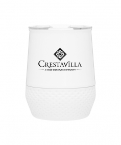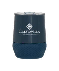 12 oz double wall 18/8 stainless steel thermal tumbler with copper vacuum insulation, push-on lid, matching swivel closure, and removable silicone base.