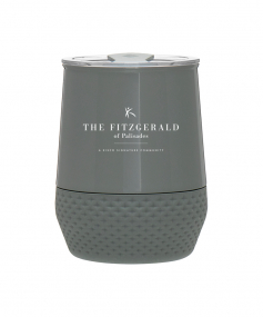 12 oz double wall 18/8 stainless steel thermal tumbler with copper vacuum insulation, push-on lid, matching swivel closure, and removable silicone base.