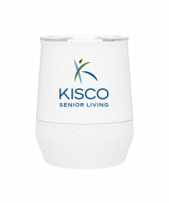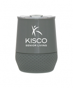 12 oz double wall 18/8 stainless steel thermal tumbler with copper vacuum insulation, push-on lid, matching swivel closure, and removable silicone base.