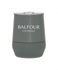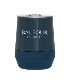 12 oz double wall 18/8 stainless steel thermal tumbler with copper vacuum insulation, push-on lid, matching swivel closure, and removable silicone base.