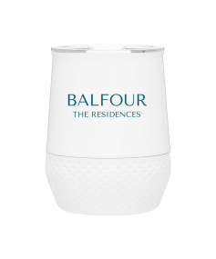 12 oz double wall 18/8 stainless steel thermal tumbler with copper vacuum insulation, push-on lid, matching swivel closure, and removable silicone base.