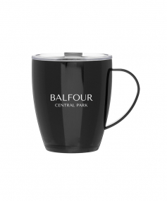 12 oz double wall 18/8 stainless steel thermal mug with copper vacuum insulation, clear acrylic push-on lid, and matching swivel; Hand wash recommended; Do not microwave; 4-7/16" h x 4"w (4-7/8 with handle) ; 355mL.