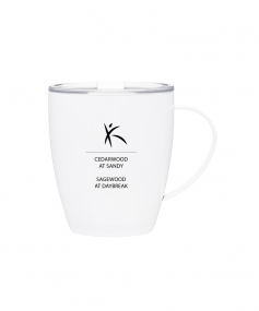 12 oz double wall 18/8 stainless steel thermal mug with copper vacuum insulation, clear acrylic push-on lid, and matching swivel; Hand wash recommended; Do not microwave; 4-7/16" h x 4"w (4-7/8 with handle) ; 355mL.