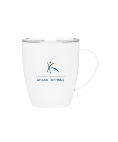 12 oz double wall 18/8 stainless steel thermal mug with copper vacuum insulation, clear acrylic push-on lid, and matching swivel; Hand wash recommended; Do not microwave; 4-7/16" h x 4"w (4-7/8 with handle) ; 355mL.