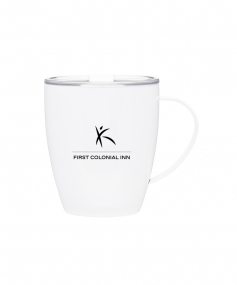 12 oz double wall 18/8 stainless steel thermal mug with copper vacuum insulation, clear acrylic push-on lid, and matching swivel; Hand wash recommended; Do not microwave; 4-7/16" h x 4"w (4-7/8 with handle) ; 355mL.
