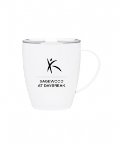 12 oz double wall 18/8 stainless steel thermal mug with copper vacuum insulation, clear acrylic push-on lid, and matching swivel; Hand wash recommended; Do not microwave; 4-7/16" h x 4"w (4-7/8 with handle) ; 355mL.