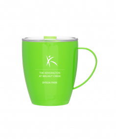 12 oz double wall 18/8 stainless steel thermal mug with copper vacuum insulation, clear acrylic push-on lid, and matching swivel; Hand wash recommended; Do not microwave; 4-7/16" h x 4"w (4-7/8 with handle) ; 355mL.