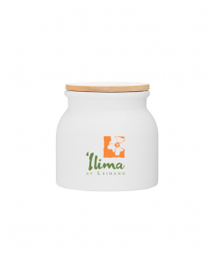 16.9 oz stoneware: matte white out / glossy white in with push-on bamboo lid; Hand wash recommended; Microwave safe with non-metallic imprint; 4 3/16 h x 4 3/16 (w/handle) w ; 500mL.