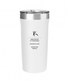 18 oz double wall 18/8 stainless steel thermal tumbler with vacuum insulation, brushed stainless steel rim, clear push-on acrylic lid with sliding closure, and powder coated finish. Hand wash recommended. Do not microwave. Complies with FDA, Prop 65. 7.25" H x 3.5" W