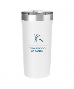 18 oz double wall 18/8 stainless steel thermal tumbler with vacuum insulation, brushed stainless steel rim, clear push-on acrylic lid with sliding closure, and powder coated finish. Hand wash recommended. Do not microwave. Complies with FDA, Prop 65. 7.25" H x 3.5" W