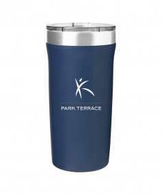 18 oz double wall 18/8 stainless steel thermal tumbler with vacuum insulation, brushed stainless steel rim, clear push-on acrylic lid with sliding closure, and powder coated finish. Hand wash recommended. Do not microwave. Complies with FDA, Prop 65. 7.25" H x 3.5" W
