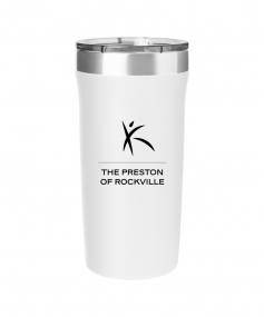 18 oz double wall 18/8 stainless steel thermal tumbler with vacuum insulation, brushed stainless steel rim, clear push-on acrylic lid with sliding closure, and powder coated finish. Hand wash recommended. Do not microwave. Complies with FDA, Prop 65. 7.25" H x 3.5" W
