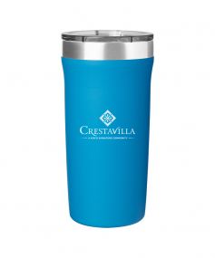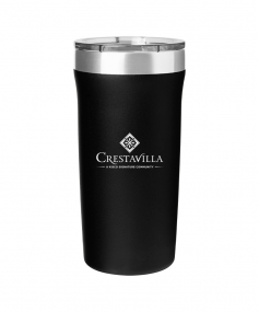 18 oz double wall 18/8 stainless steel thermal tumbler with vacuum insulation, brushed stainless steel rim, clear push-on acrylic lid with sliding closure, and powder coated finish. Hand wash recommended. Do not microwave. Complies with FDA, Prop 65. 7.25" H x 3.5" W