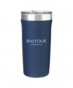 18 oz double wall 18/8 stainless steel thermal tumbler with vacuum insulation, brushed stainless steel rim, clear push-on acrylic lid with sliding closure, and powder coated finish. Hand wash recommended. Do not microwave. Complies with FDA, Prop 65. 7.25" H x 3.5" W