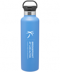 24 oz powder coated double wall 18/8 stainless steel thermal bottle with copper vacuum insulation, threaded gear-shaped insulated lid and carrying handle Complies with FDA, Prop 65. 11.25" H x 3" W