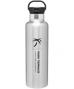 24 oz powder coated double wall 18/8 stainless steel thermal bottle with copper vacuum insulation, threaded gear-shaped insulated lid and carrying handle Complies with FDA, Prop 65. 11.25" H x 3" W