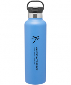 24 oz powder coated double wall 18/8 stainless steel thermal bottle with copper vacuum insulation, threaded gear-shaped insulated lid and carrying handle Complies with FDA, Prop 65. 11.25" H x 3" W