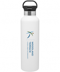 24 oz powder coated double wall 18/8 stainless steel thermal bottle with copper vacuum insulation, threaded gear-shaped insulated lid and carrying handle Complies with FDA, Prop 65. 11.25" H x 3" W