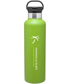 24 oz powder coated double wall 18/8 stainless steel thermal bottle with copper vacuum insulation, threaded gear-shaped insulated lid and carrying handle Complies with FDA, Prop 65. 11.25" H x 3" W