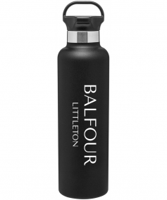 24 oz powder coated double wall 18/8 stainless steel thermal bottle with copper vacuum insulation, threaded gear-shaped insulated lid and carrying handle Complies with FDA, Prop 65. 11.25" H x 3" W