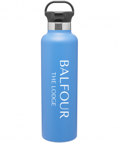 24 oz powder coated double wall 18/8 stainless steel thermal bottle with copper vacuum insulation, threaded gear-shaped insulated lid and carrying handle Complies with FDA, Prop 65. 11.25" H x 3" W