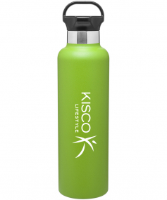 24 oz powder coated double wall 18/8 stainless steel thermal bottle with copper vacuum insulation, threaded gear-shaped insulated lid and carrying handle Complies with FDA, Prop 65. 11.25" H x 3" W