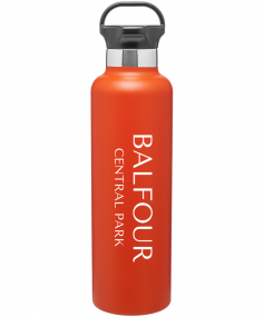 24 oz powder coated double wall 18/8 stainless steel thermal bottle with copper vacuum insulation, threaded gear-shaped insulated lid and carrying handle Complies with FDA, Prop 65. 11.25" H x 3" W