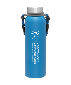 32 oz double wall 18/8 stainless steel thermal bottle with copper vacuum insulation, insulated stainless steel threaded lid, silicone ring, removable strap with buckles, removable clasps, and powder coated finish. Individual gift box. Hand wash recommended. Do not microwave. Complies with FDA, Prop 65. 11" H x 3.1875" W