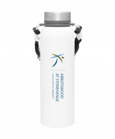 32 oz double wall 18/8 stainless steel thermal bottle with copper vacuum insulation, insulated stainless steel threaded lid, silicone ring, removable strap with buckles, removable clasps, and powder coated finish. Individual gift box. Hand wash recommended. Do not microwave. Complies with FDA, Prop 65. 11" H x 3.1875" W