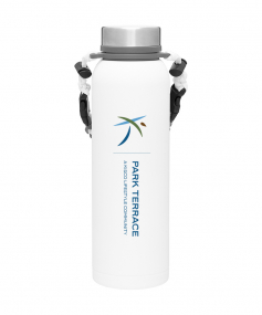 32 oz double wall 18/8 stainless steel thermal bottle with copper vacuum insulation, insulated stainless steel threaded lid, silicone ring, removable strap with buckles, removable clasps, and powder coated finish. Individual gift box. Hand wash recommended. Do not microwave. Complies with FDA, Prop 65. 11" H x 3.1875" W