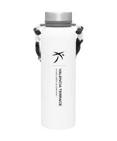 32 oz double wall 18/8 stainless steel thermal bottle with copper vacuum insulation, insulated stainless steel threaded lid, silicone ring, removable strap with buckles, removable clasps, and powder coated finish. Individual gift box. Hand wash recommended. Do not microwave. Complies with FDA, Prop 65. 11" H x 3.1875" W