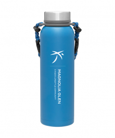 32 oz double wall 18/8 stainless steel thermal bottle with copper vacuum insulation, insulated stainless steel threaded lid, silicone ring, removable strap with buckles, removable clasps, and powder coated finish. Individual gift box. Hand wash recommended. Do not microwave. Complies with FDA, Prop 65. 11" H x 3.1875" W