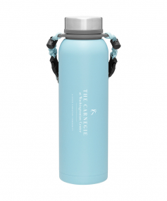 32 oz double wall 18/8 stainless steel thermal bottle with copper vacuum insulation, insulated stainless steel threaded lid, silicone ring, removable strap with buckles, removable clasps, and powder coated finish. Individual gift box. Hand wash recommended. Do not microwave. Complies with FDA, Prop 65. 11" H x 3.1875" W