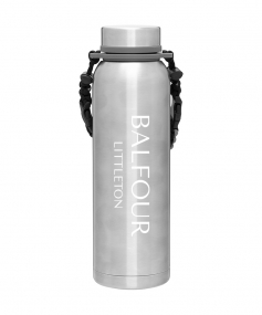 32 oz double wall 18/8 stainless steel thermal bottle with copper vacuum insulation, insulated stainless steel threaded lid, silicone ring, removable strap with buckles, removable clasps, and powder coated finish. Individual gift box. Hand wash recommended. Do not microwave. Complies with FDA, Prop 65. 11" H x 3.1875" W