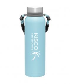 32 oz double wall 18/8 stainless steel thermal bottle with copper vacuum insulation, insulated stainless steel threaded lid, silicone ring, removable strap with buckles, removable clasps, and powder coated finish. Individual gift box. Hand wash recommended. Do not microwave. Complies with FDA, Prop 65. 11" H x 3.1875" W