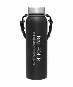 32 oz double wall 18/8 stainless steel thermal bottle with copper vacuum insulation, insulated stainless steel threaded lid, silicone ring, removable strap with buckles, removable clasps, and powder coated finish. Individual gift box. Hand wash recommended. Do not microwave. Complies with FDA, Prop 65. 11" H x 3.1875" W