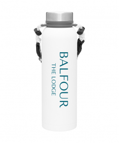 32 oz double wall 18/8 stainless steel thermal bottle with copper vacuum insulation, insulated stainless steel threaded lid, silicone ring, removable strap with buckles, removable clasps, and powder coated finish. Individual gift box. Hand wash recommended. Do not microwave. Complies with FDA, Prop 65. 11" H x 3.1875" W