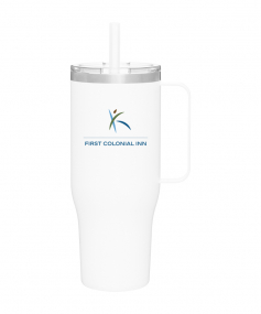 40 oz double wall 18/8 stainless steel thermal mug with copper vacuum insulation, stainless steel rim, dual-purpose push-on clear lid, matching sliding closure, flexible wide silicone straw, and powder coated finish. Individual gift box. Hand wash recommended. Do not microwave. Complies with FDA, Prop 65. 9.75" H x 4" W