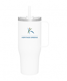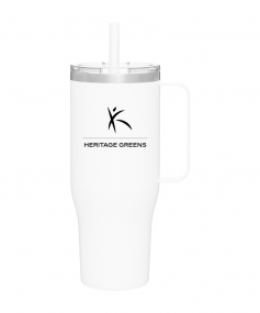 40 oz double wall 18/8 stainless steel thermal mug with copper vacuum insulation, stainless steel rim, dual-purpose push-on clear lid, matching sliding closure, flexible wide silicone straw, and powder coated finish. Individual gift box. Hand wash recommended. Do not microwave. Complies with FDA, Prop 65. 9.75" H x 4" W