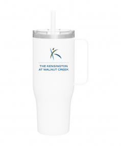 40 oz double wall 18/8 stainless steel thermal mug with copper vacuum insulation, stainless steel rim, dual-purpose push-on clear lid, matching sliding closure, flexible wide silicone straw, and powder coated finish. Individual gift box. Hand wash recommended. Do not microwave. Complies with FDA, Prop 65. 9.75" H x 4" W