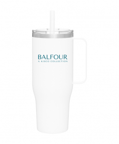 40 oz double wall 18/8 stainless steel thermal mug with copper vacuum insulation, stainless steel rim, dual-purpose push-on clear lid, matching sliding closure, flexible wide silicone straw, and powder coated finish. Individual gift box. Hand wash recommended. Do not microwave. Complies with FDA, Prop 65. 9.75" H x 4" W