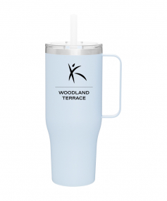 40 oz double wall 18/8 stainless steel thermal mug with copper vacuum insulation, stainless steel rim, dual-purpose push-on clear lid, matching sliding closure, flexible wide silicone straw, and powder coated finish. Individual gift box. Hand wash recommended. Do not microwave. Complies with FDA, Prop 65. 9.75" H x 4" W