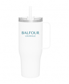 40 oz double wall 18/8 stainless steel thermal mug with copper vacuum insulation, stainless steel rim, dual-purpose push-on clear lid, matching sliding closure, flexible wide silicone straw, and powder coated finish. Individual gift box. Hand wash recommended. Do not microwave. Complies with FDA, Prop 65. 9.75" H x 4" W
