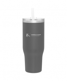 40 oz double wall 18/8 stainless steel thermal tumbler with copper vacuum insulation, stainless steel rim, dual-purpose push-on clear lid, matching sliding closure, flexible wide silicone straw, and powder coated finish