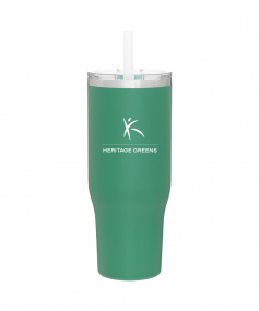 40 oz double wall 18/8 stainless steel thermal tumbler with copper vacuum insulation, stainless steel rim, dual-purpose push-on clear lid, matching sliding closure, flexible wide silicone straw, and powder coated finish